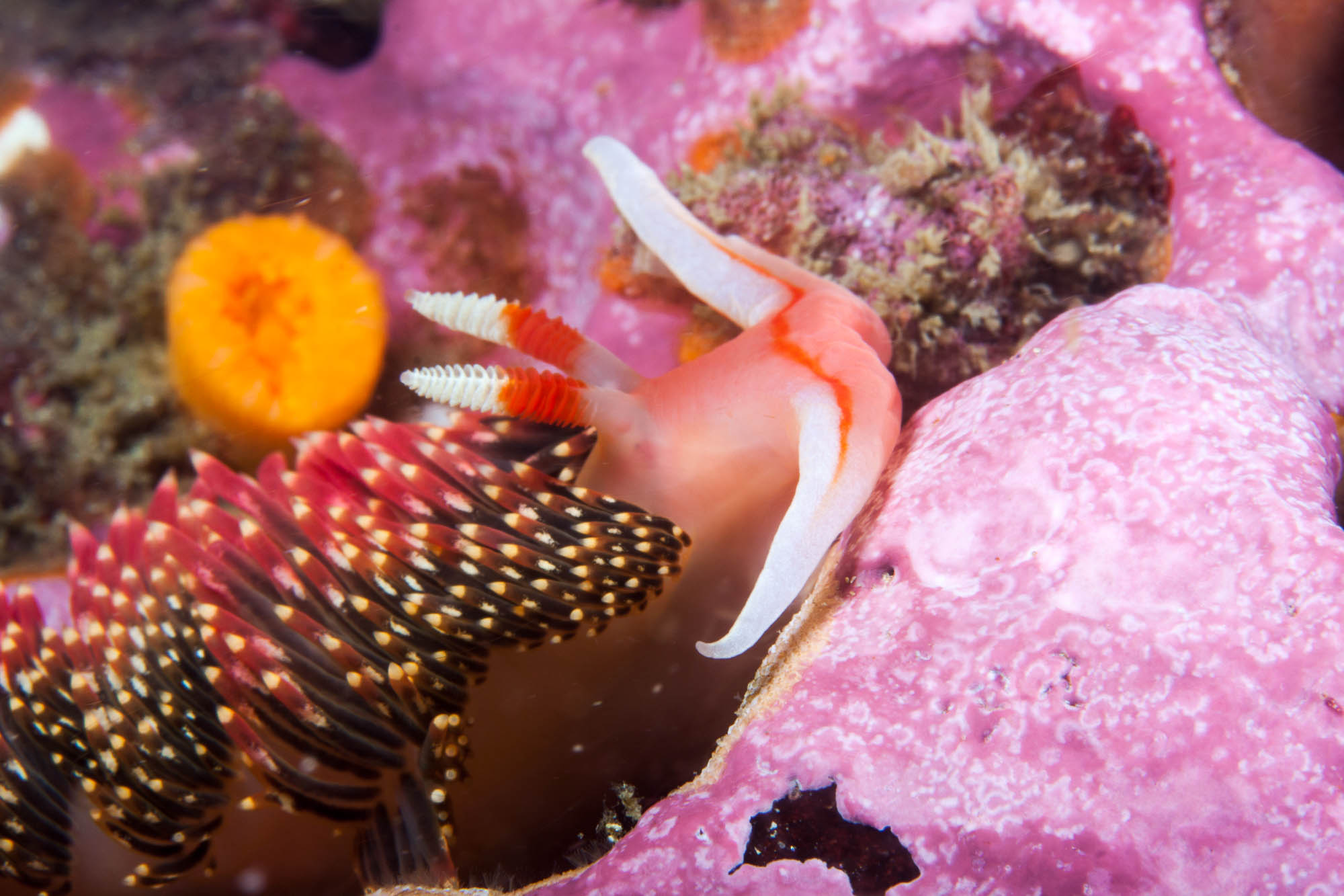 This was California pea soup diving at its very best. Water had finally warmed up a bit since the last time out to San Miguel, but viz had gone to nil. Not quite, but 3-5 ft was about it. But who cares what’s more than 3 ft out with a macro lens anyway? Lots and lots of nudis, including 2 I have never seen before. And to round it off, I swam into (and almost stepped onto) a Wolf eel.