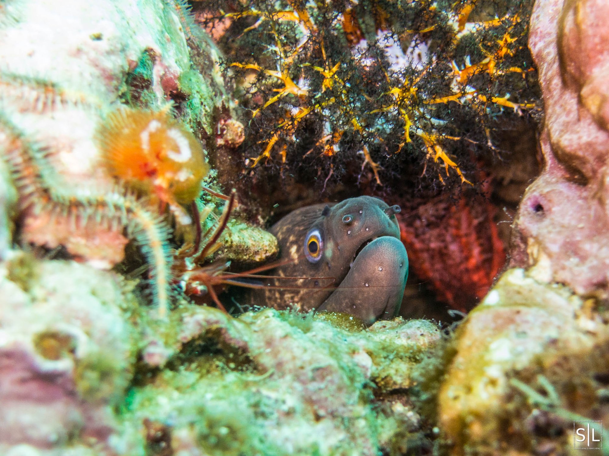 By noon the currents had died down to make the descent and surfacing a lot more pleasant. Unfortunately the current weren’t the only thing that died. The battery for the strobes on my camera died as well. So I was left with my little point-and-shoot. Somehow I never quite managed to get good colors with that small camera. Not sure why. But that aside, on the last dive I found a moray eel and finally had something interesting to shoot.