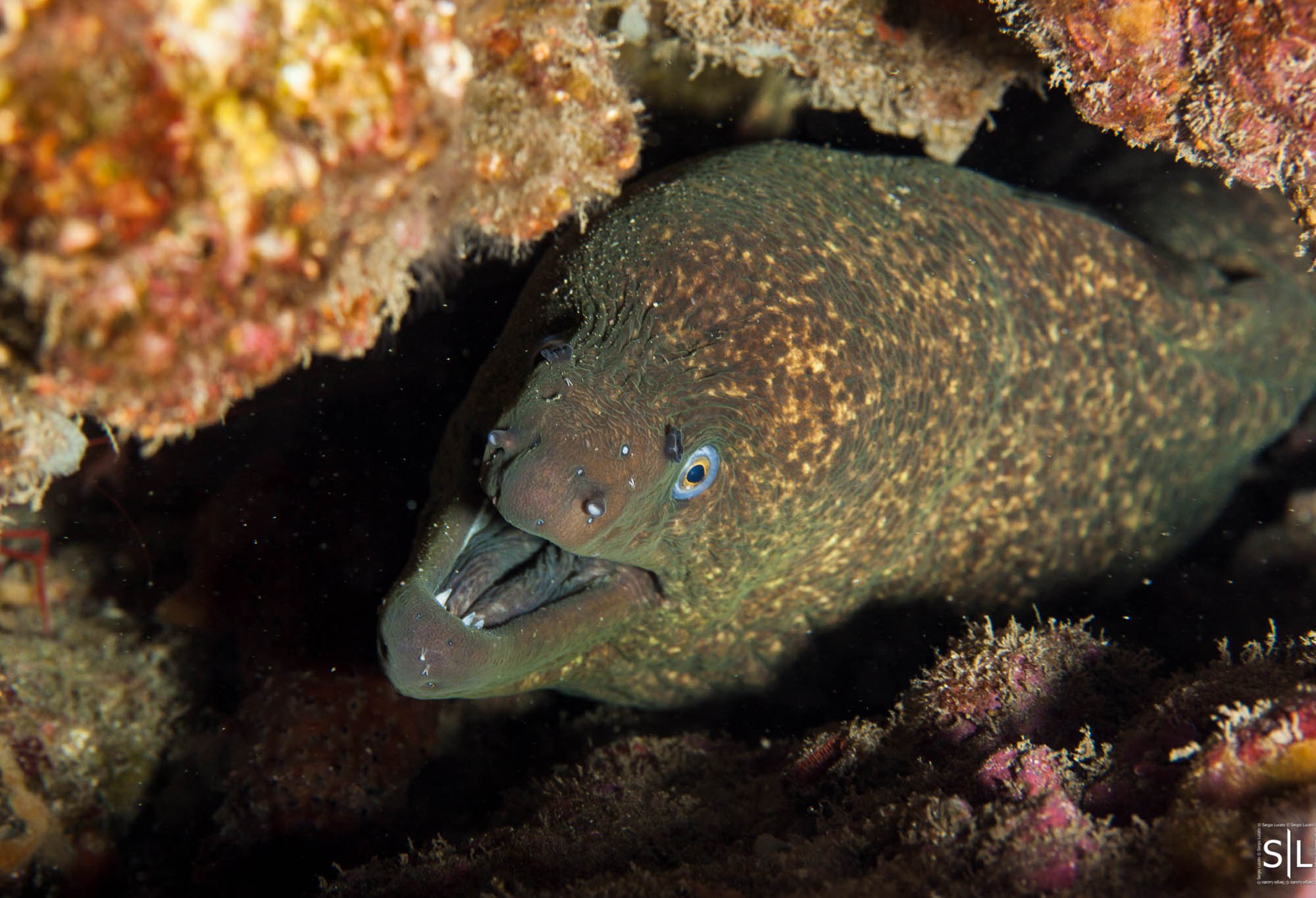 On the last dive on Underwater Island, one of my favorite dive sites, I had a rather large Moray eel waiting. I never know if I can trust these things or not, so I didn’t linger around too long. Their front teeth look like they could do some real damage. The crowning jewel of the day came literally at the last minute. Of my safety stop that is. An Angel shark came cruising by. As I still had enough air, I decided to take after it. Never mind that he was in no hurry, I kicked my lungs out trying to keep up with him. Not much of a photo, but a great sight.