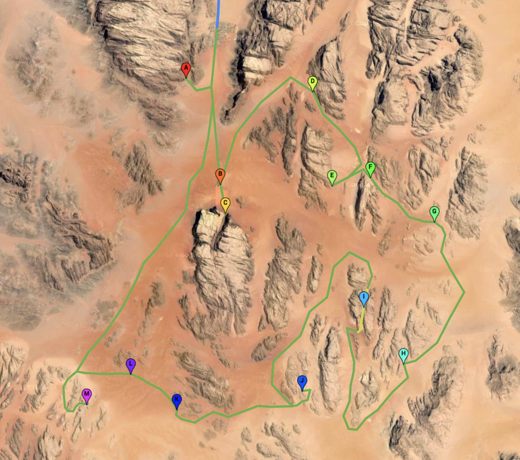 There were quite a few stops along the way and most offered an opportunity to go out and hike a bit. First stop was Lawrence Spring, although there is a bit of an ambiguity about it. There are two springs, Abu Aineh and Ain Shalaaleh, the second being the actual Lawrence Spring. I am not sure which one we went to, but it was a nice scramble up the boulder field and a beautiful view. Along the way we stopped at a couple sand dunes, ancient petroglyphs and funny shaped rocks. Of mention is Um Frouth Arch, a small arch with a very steep side that can be hiked up. Although I am not sure if hiking is the right term here. It is more of a scramble on all four type thing, but great fun.