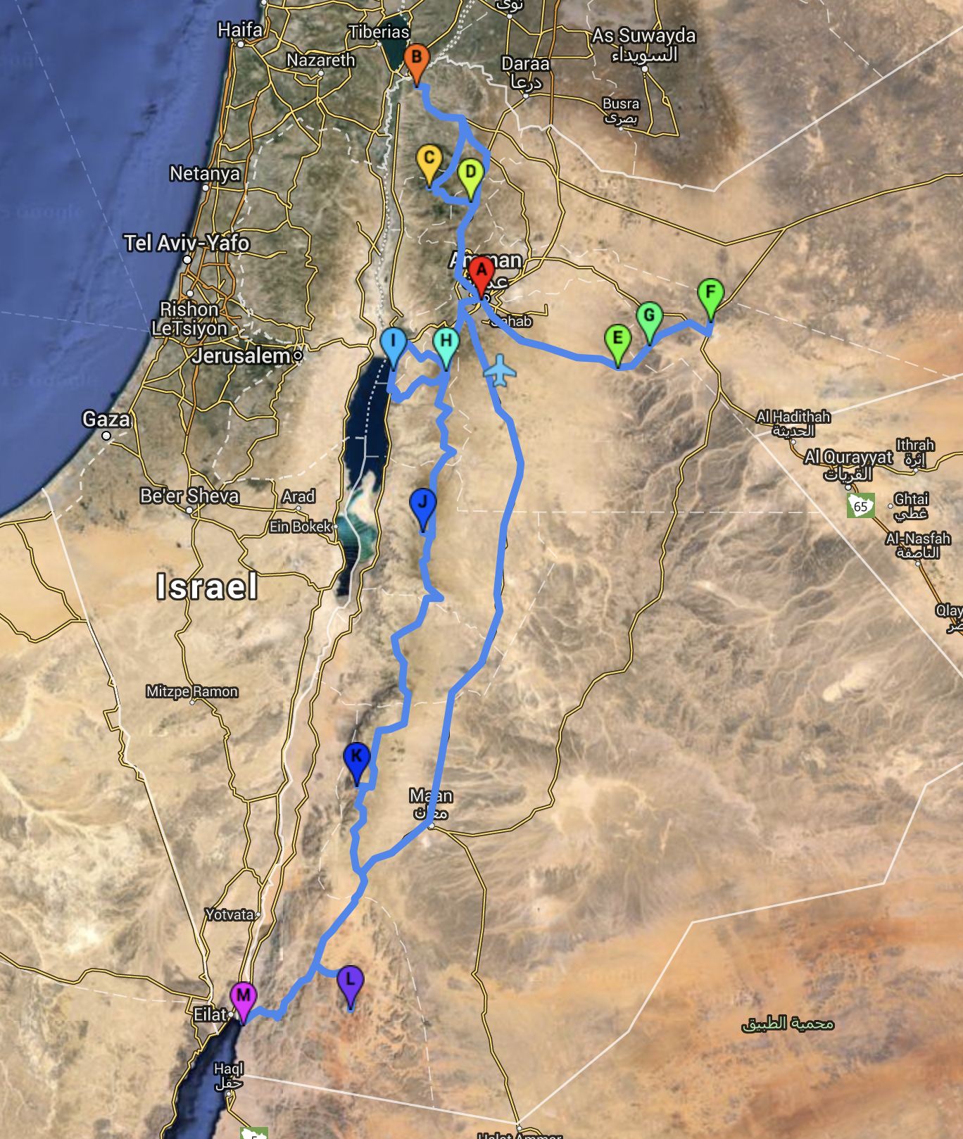 The trip started with a very long travel day with a stop in London. We finally arrived rather late at our Amman base, the Hawa Guest House in downtown Amman. We booked the premium room with ensuite bathroom, but ended up with the even larger family room. It is a very lovely bed & breakfast with very friendly and helpful owners and lots of cats for entertainment.