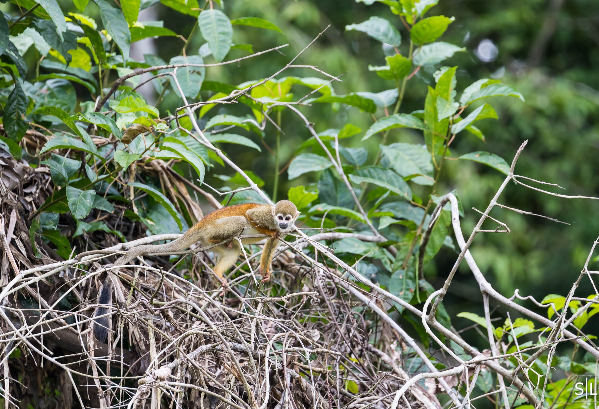 I do have one fun side story. There are a couple photos of Squirrel Monkeys with an Iguana. Those monkeys always move in a huge group. As it happened the only branch connecting two trees was already occupied by an Iguana. So monkey after monkey happily ran along until they suddenly spotted the reptile and froze. That was followed by a panicked look and lots of head-scratching to decide wether to turn around or brave the monster. In the end they all made it across, but it was clear they did not trust the Iguana.